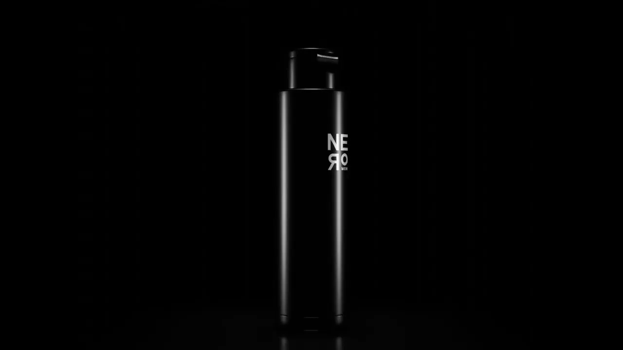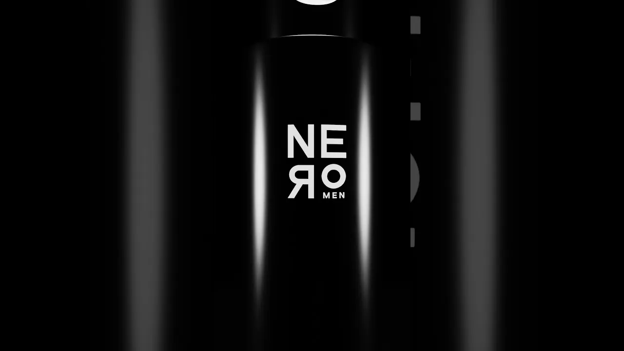 Un flacon NERO qui émerge de l’ombre, se révèle subtilement par la lumière, puis disparaît au profit du logo.